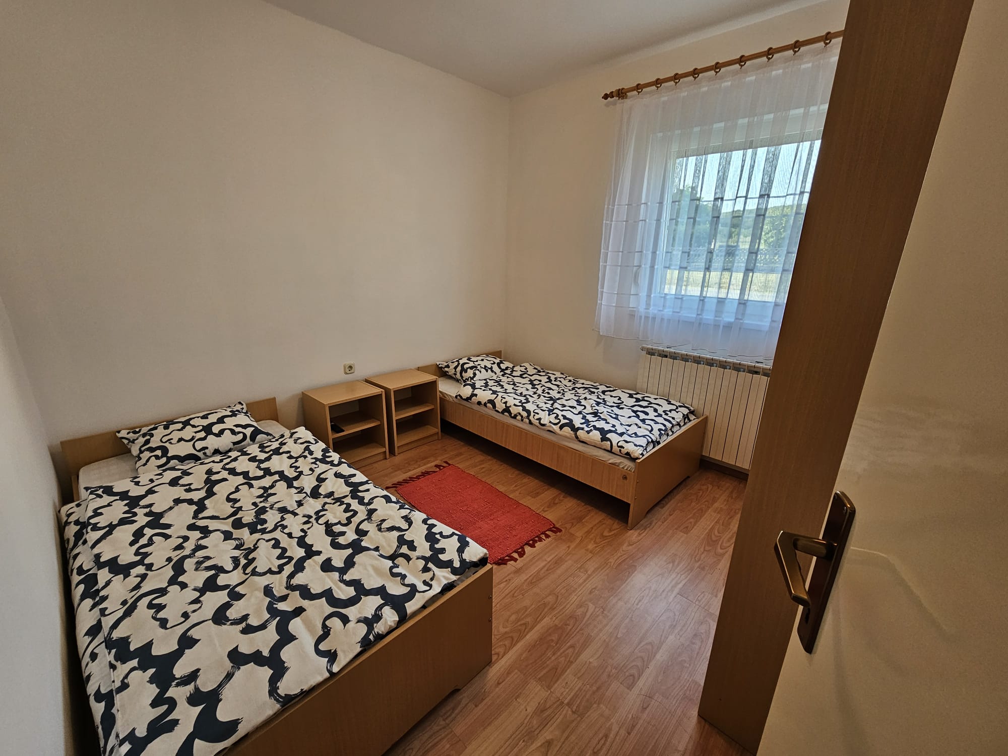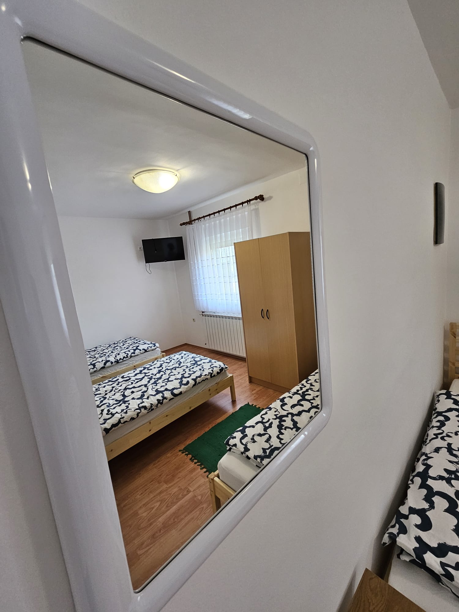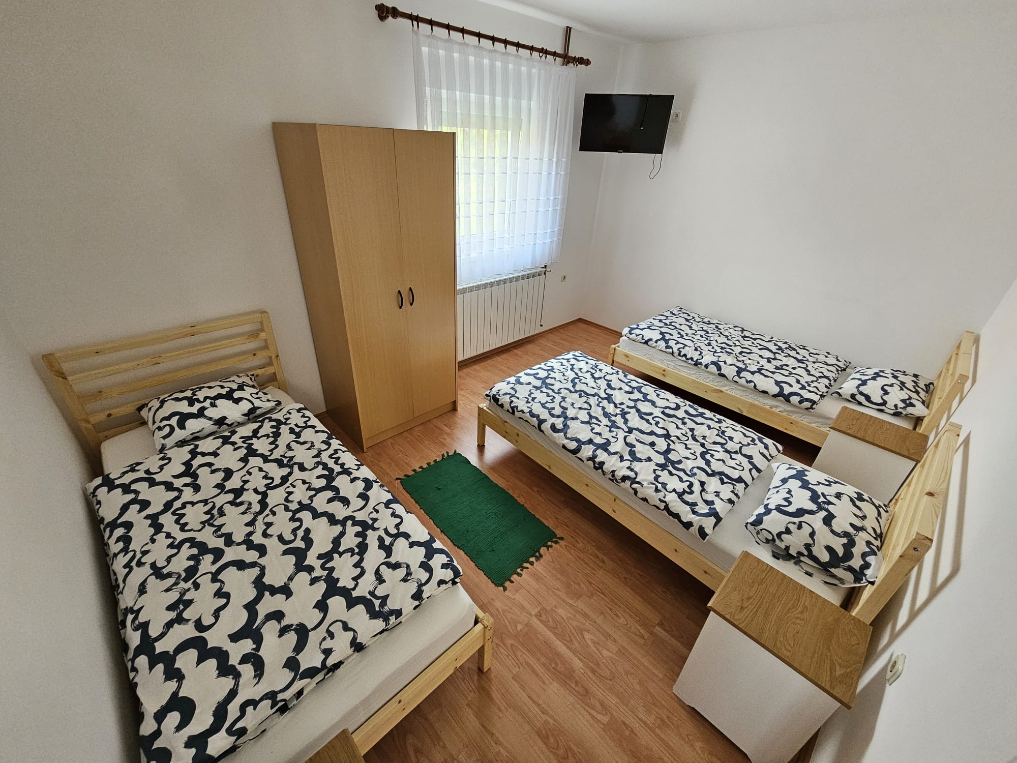 Sobe: Jedna trokrevetna i dvije dvokrevetne sobe, opremljene udobnim krevetima, televizorima, noćnim ormarićima i velikim ormarima.