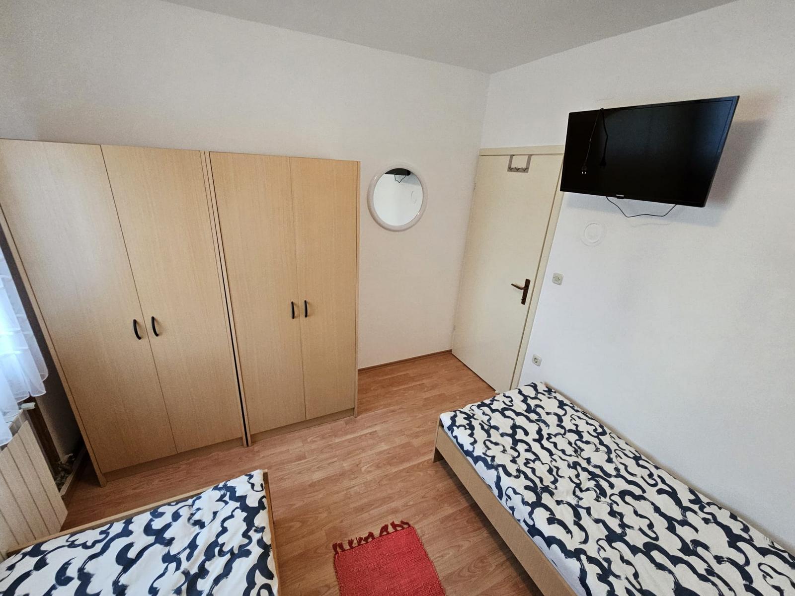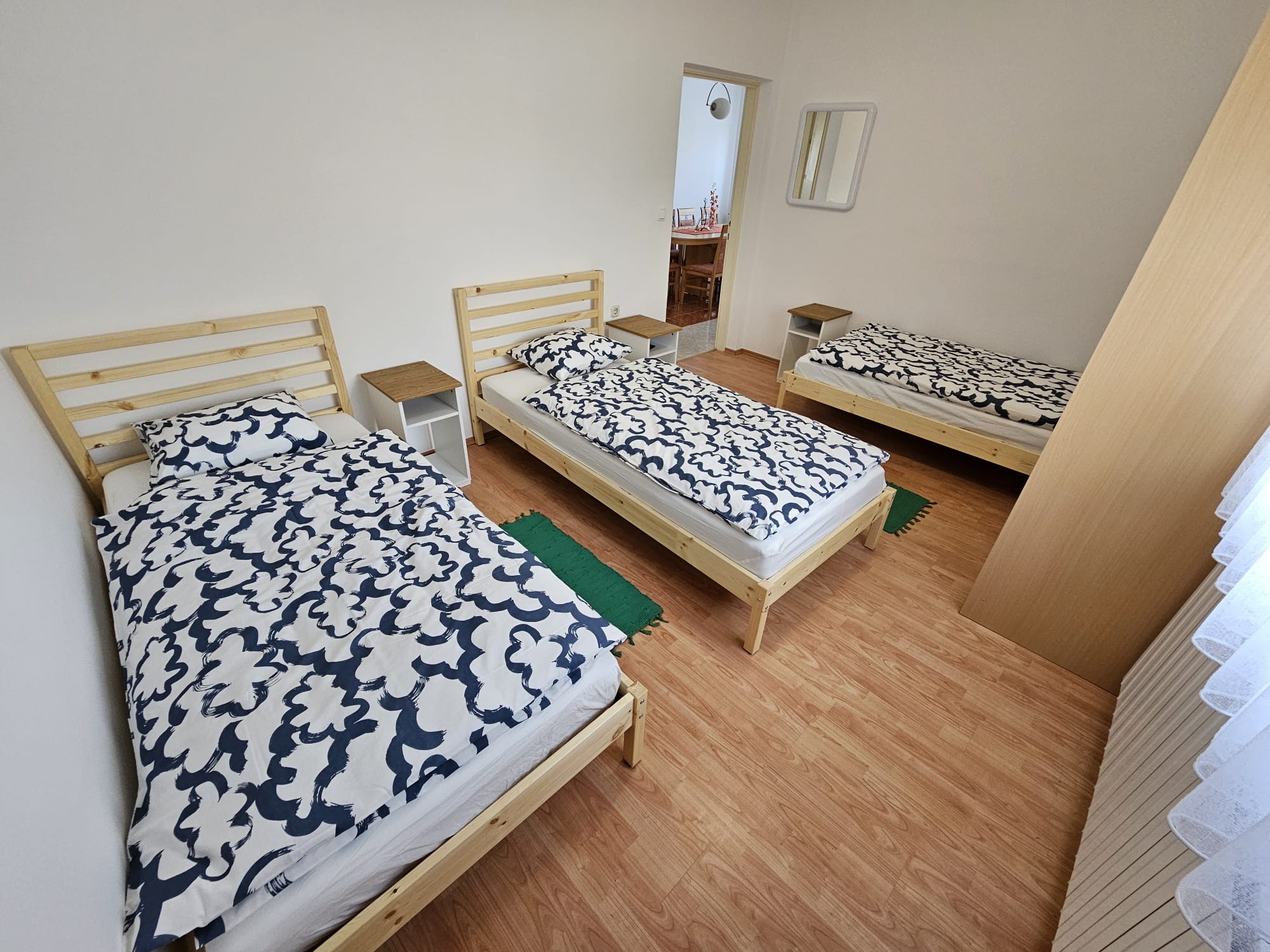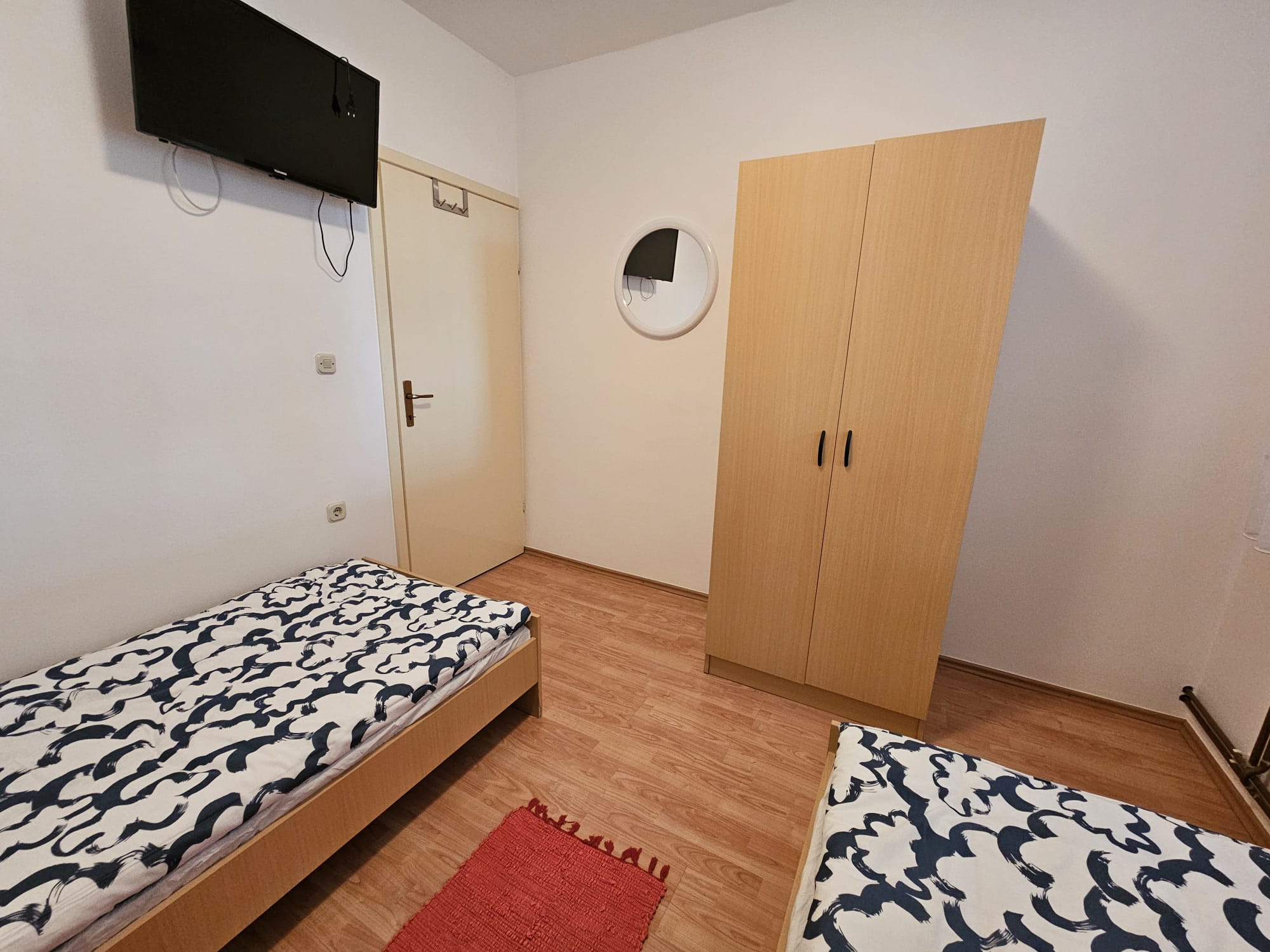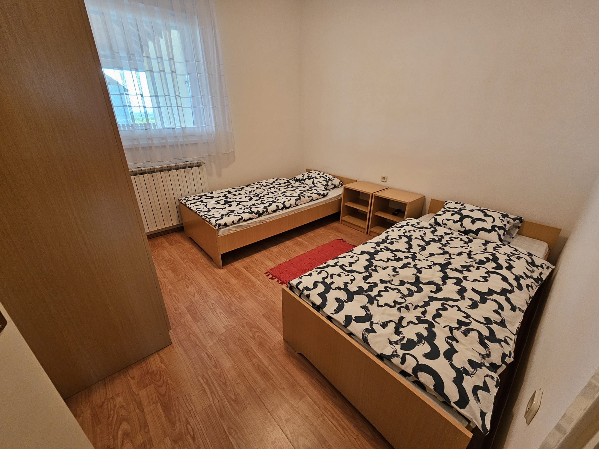Sobe: Jedna trokrevetna i dvije dvokrevetne sobe, opremljene udobnim krevetima, televizorima, noćnim ormarićima i velikim ormarima.